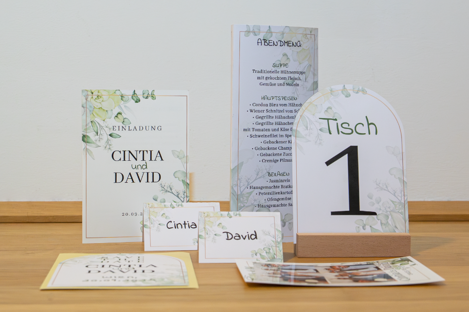 Von Save-the-Date über Einladungen bis hin zu Menükarten und Dankeskarten: Wir entwickeln ein stimmiges Papeterie-Konzept, das sich wie ein roter Faden durch eure Hochzeit zieht – hochwertig, persönlich und einzigartig.